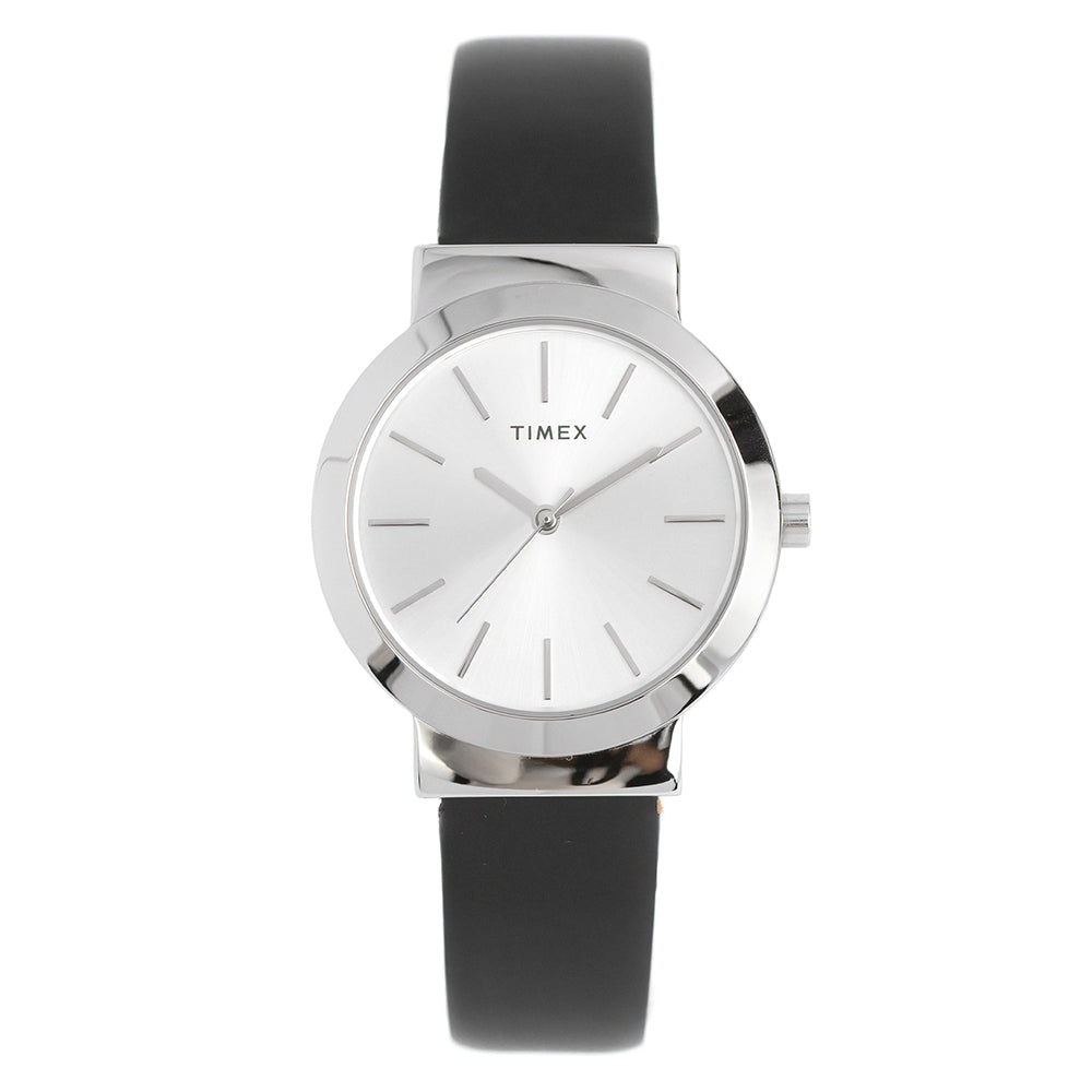 This 34mm women's silver-tone watch showcases a minimalist dial and an elegant black leather strap. Its modern, elegant design is perfect for the fashion-forward woman who loves versatile, everyday sophistication.