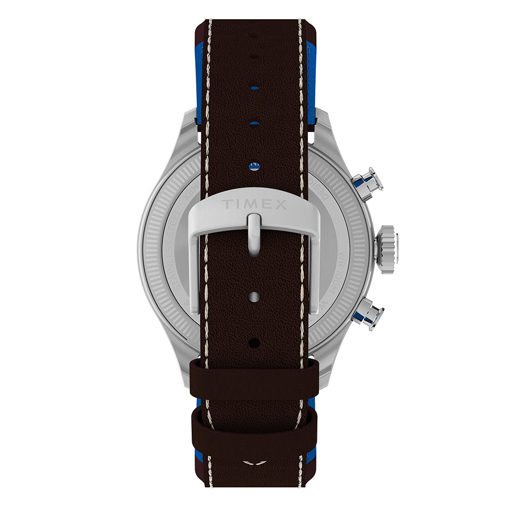 Our latest Pan Am offering captures the spirit of the golden age of aviation. It brings a new 41mm brushed recycled stainless-steel case to our Waterbury collection and presents the clean, military-style design of a traditional pilot watch. It proudly features a sapphire crystal with anti-reflective coating, luminant hands, and an impressionist airplane motif on the silver-tone sunray dial. This same airplane appears on the sustainably tanned natural leather strap from the Leather Working Group (LWG), complete with contrast stitching, iconic Pan Am blue lining, and quick-release spring bars for easy strap changes without the need for tools.