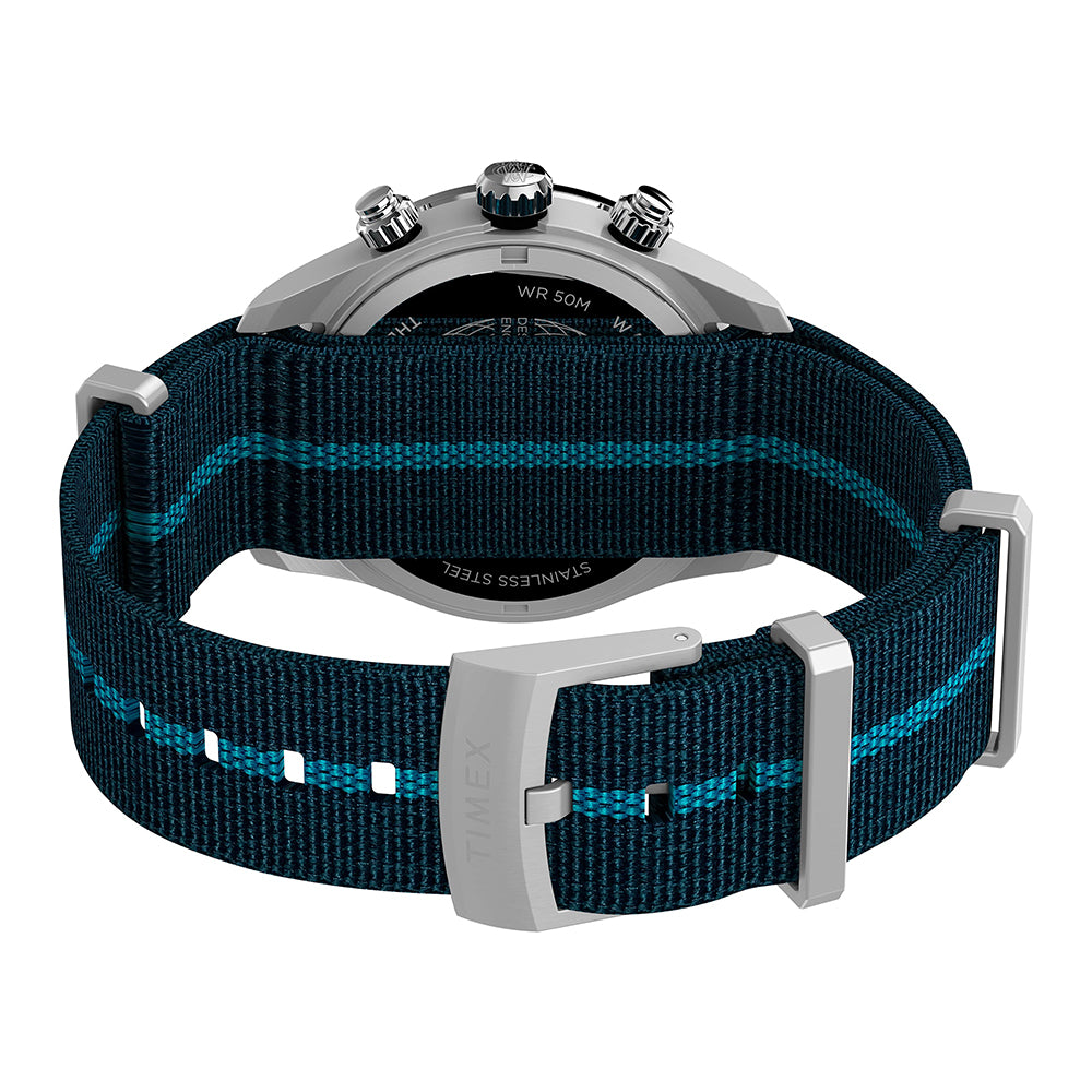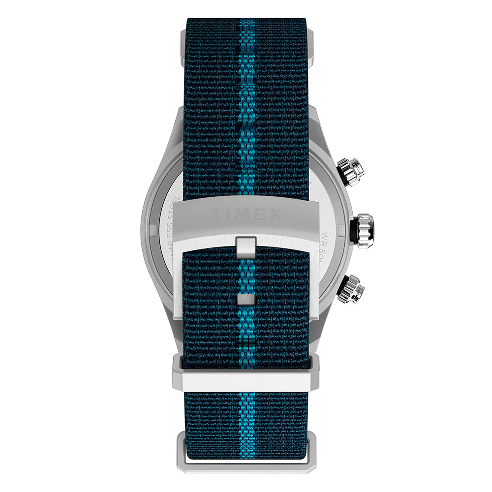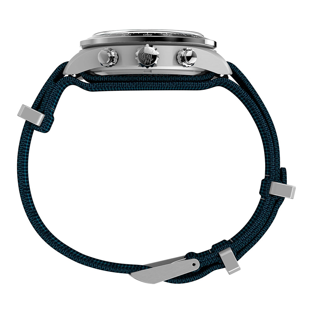 The Waterbury Heritage Chronograph combines modern functionality with timeless design, featuring a chronograph to track elapsed time and a black tachymeter bezel for determining average speed. Complementing its 39mm brushed recycled stainless-steel case is a striped recycled fabric strap that channels the effortless tailoring of classic American menswear. Double-layered for durability and designed with convenient slip-thru construction for easy on and off, it delivers a laid-back confidence on the wrist. The black or silver-tone dial is accented by contrasting sub-dials and safeguarded by an anti-reflective mineral glass crystal for enhanced clarity. Luminant hands ensure visibility in lowlight conditions, while applied indices and intricate detailing on the crown and pushers add a refined touch.