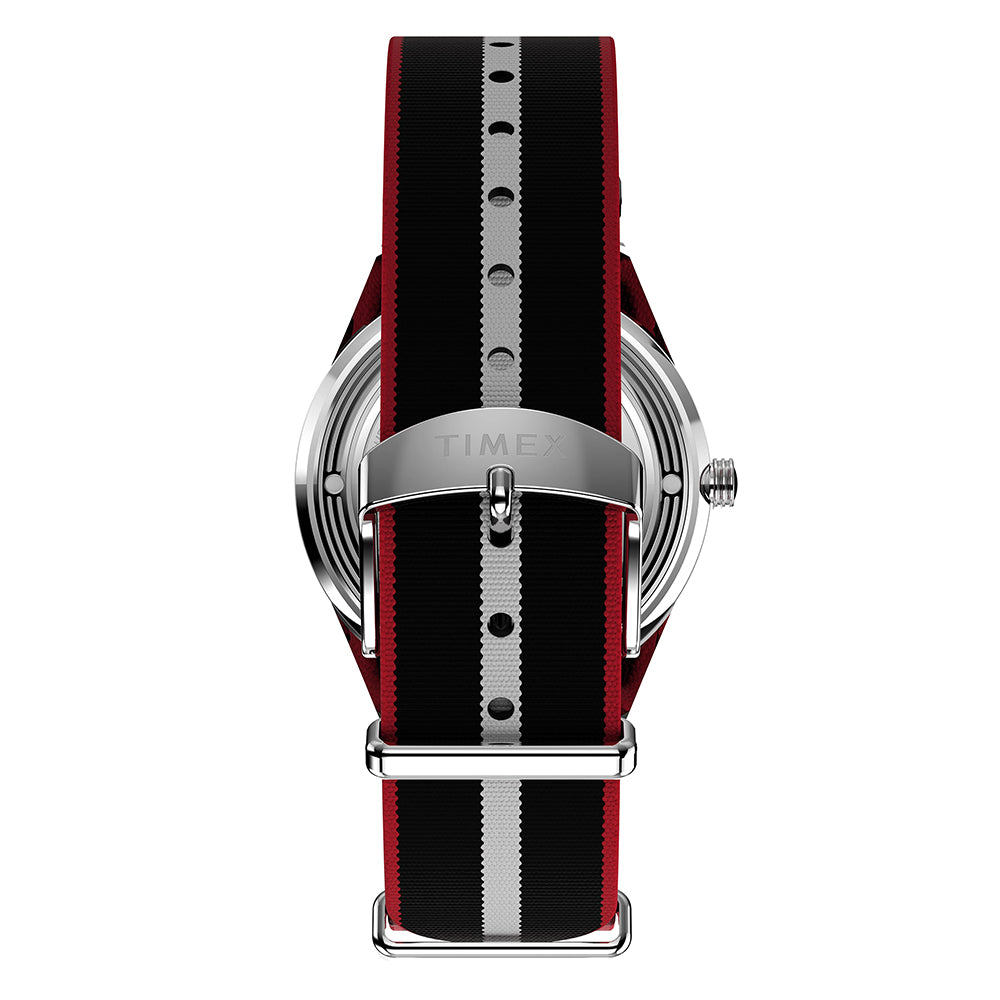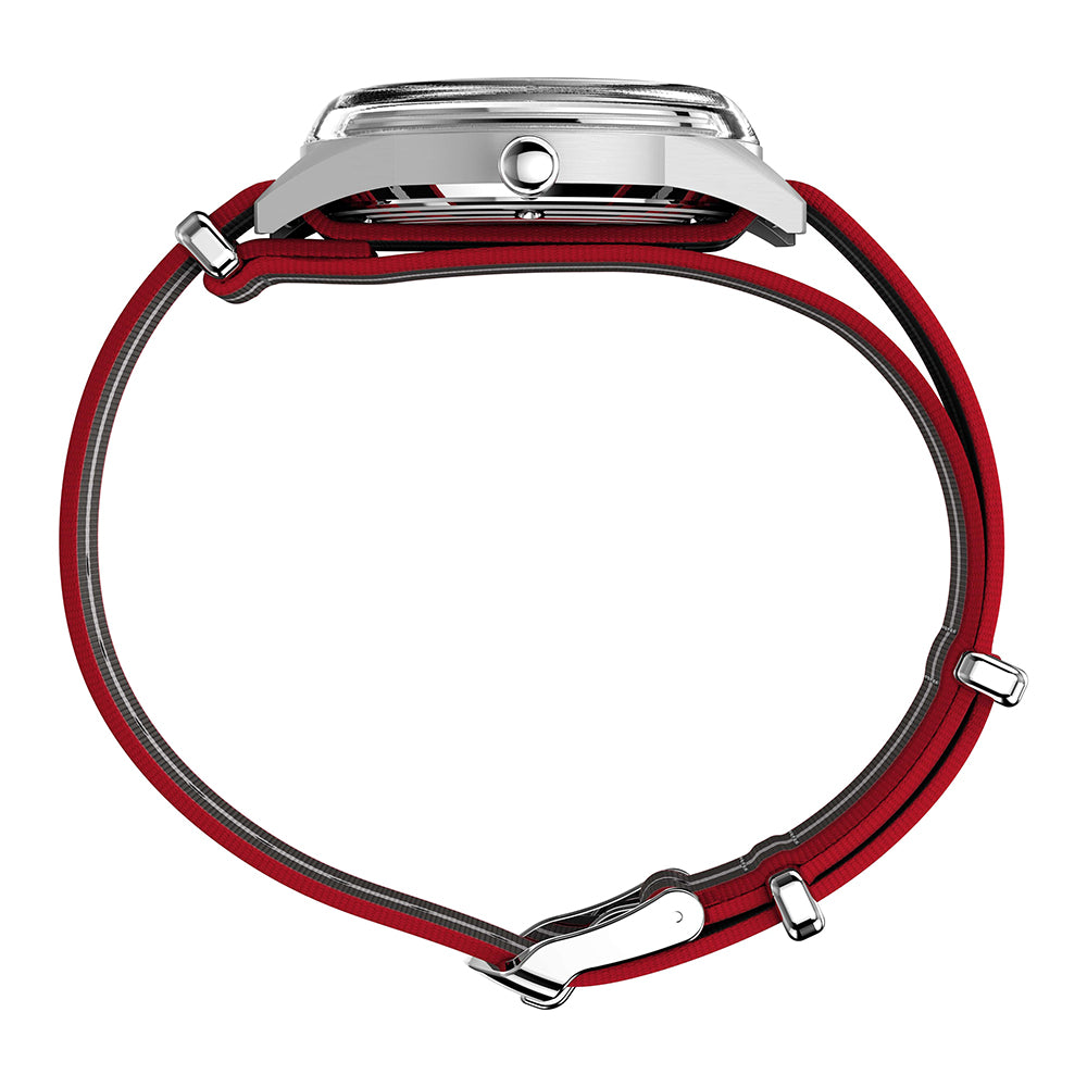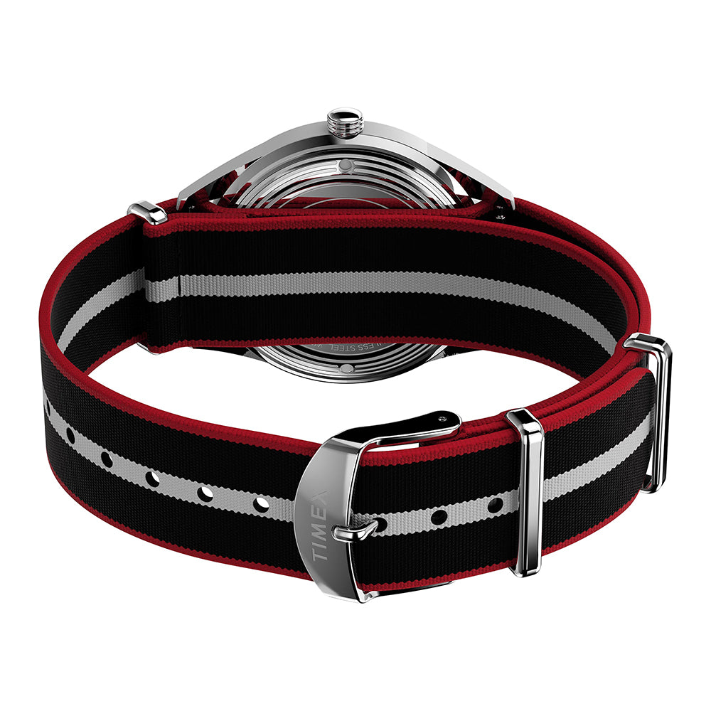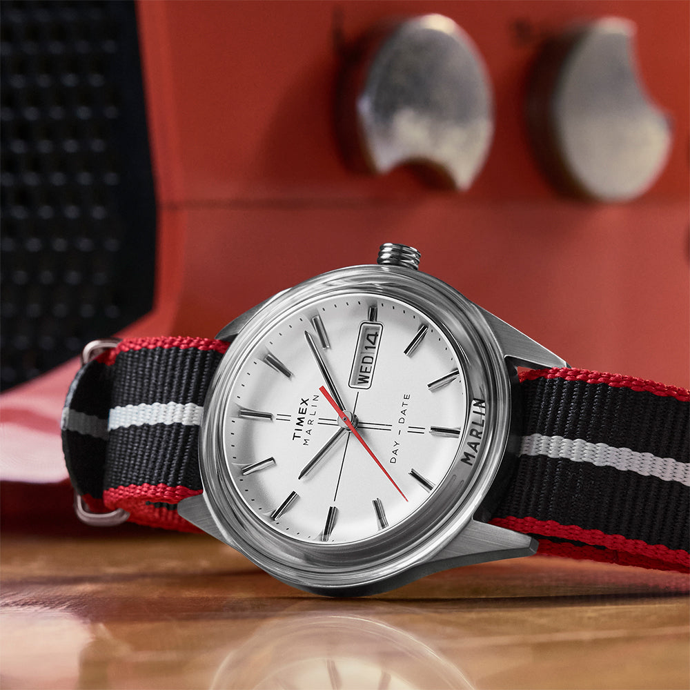 Our Marlin Jet captures futuristic design ideals of the ‘60s with understated details and a sleek 38mm brushed stainless-steel case. However, its most defining feature is the domed crystal. Made from Hesalite—a refined form of acrylic favored for its clarity and ease of maintenance—the crystal covers the entire top surface of the watch case, enveloping the grooved bezel bearing the Marlin name and bringing captivating depth to the watch's retro-futuristic appearance. It blends seamlessly into the flat case sides, leaving only the lugs exposed. The case sides smoothly transition to a screwed-on case back that mirrors the crystal’s domed contour, enhancing the watch’s streamlined profile and space-age aesthetics. You’ll find a concentric circle pattern in three key locations on this timepiece: beneath the dome on the inner bezel, on the crown, and on the case back. The silver, blue, or green matte concave dial showcases a crosshair pattern punctuated with a day and date window beside the 3 o’clock marker, and we’ve paired this timepiece with a double-layered recycled fabric slip-thru strap that introduces a more casual element to its clean design.