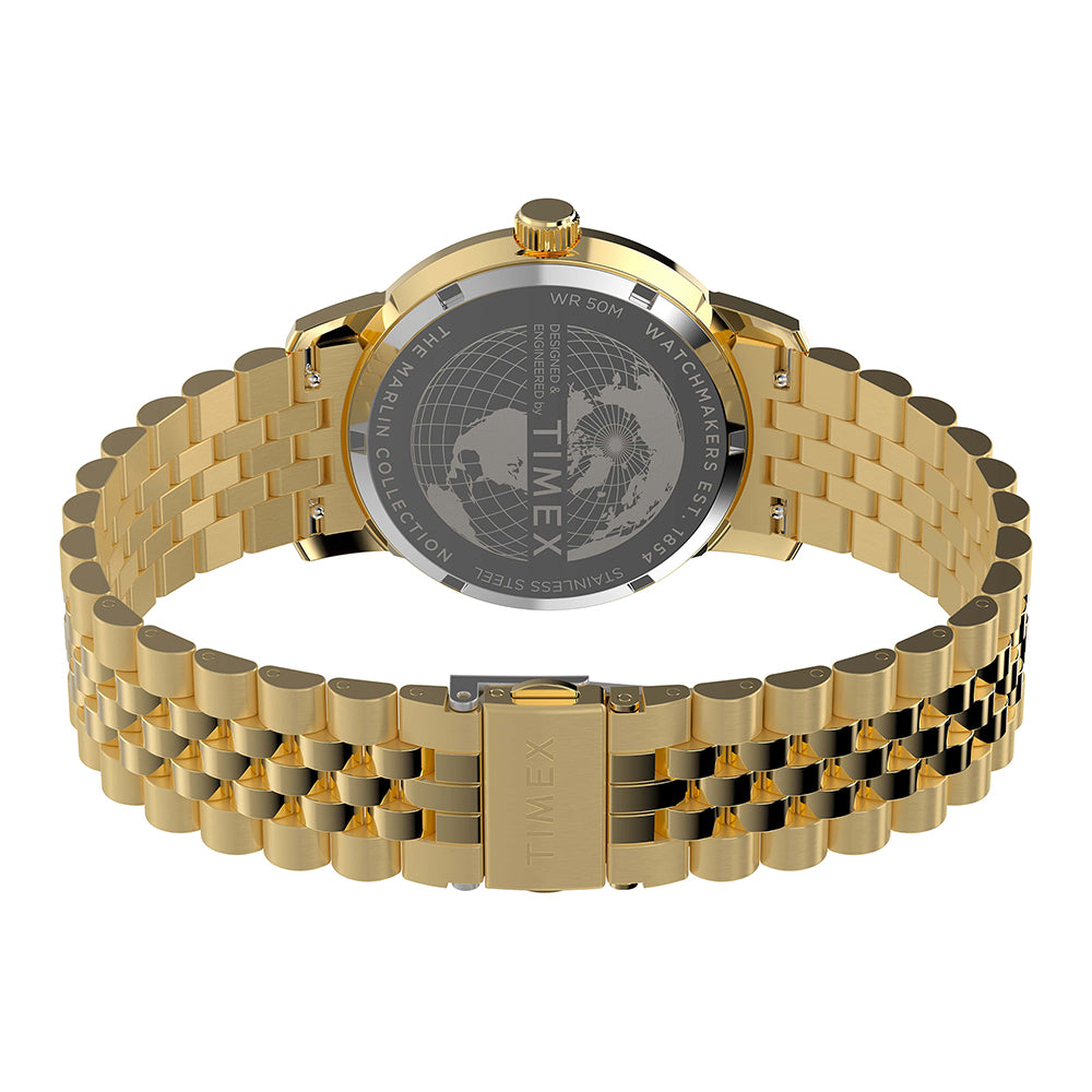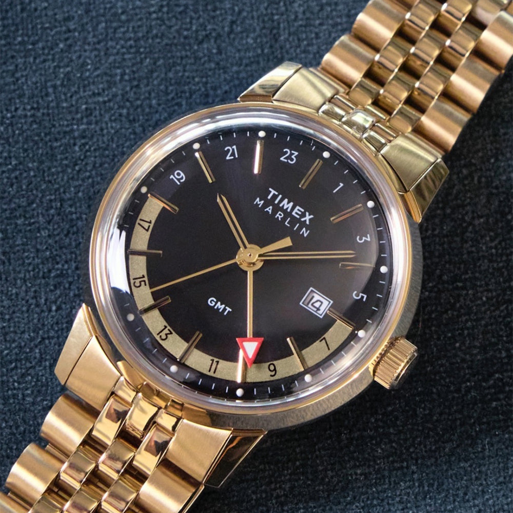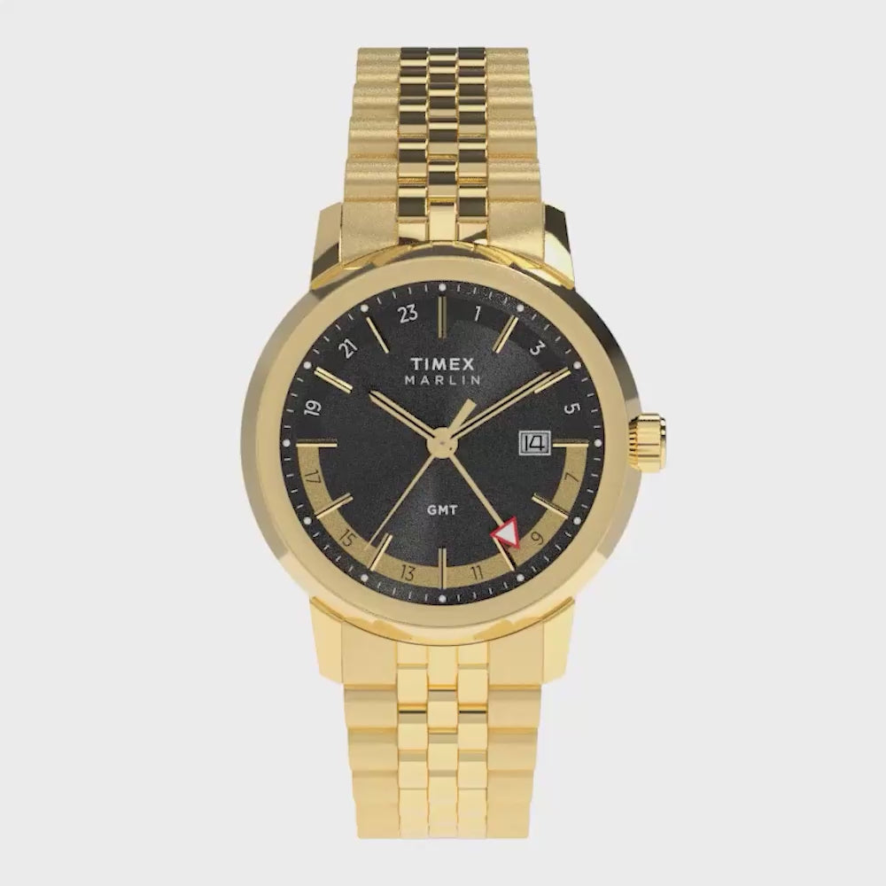 The Marlin Quartz GMT brings dual time zone tracking to our ‘60s Marlin. Housed in a 40mm polished recycled stainless-steel case, the sunray dial presents faceted markers, a date window, and a sophisticated tonal GMT index accompanied by a prominent red triangle GMT hand. Keeping in line with its Marlin heritage, this timepiece features a vintage-style domed acrylic crystal, and we’ve paired it with a brushed and polished stainless-steel bracelet.