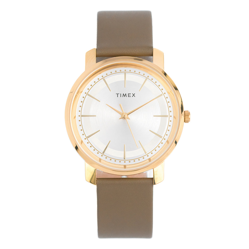 A classic and versatile Timex dress watch featuring a 38mm gold-tone case, a sleek three-hand dial, and a genuine brown leather strap. With its minimalist design and refined details, this watch pairs effortlessly with both formal and casual outfits, offering timeless style and reliable timekeeping.