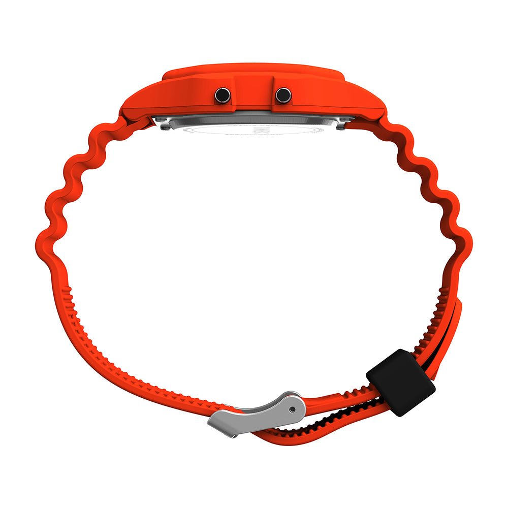 This watch celebrates humanity's journey to the farthest reaches of space. Built with a lightweight resin case and bracelet in space-suit orange, it channels both utility and uplift. Other details include our INDIGLO® backlight for nighttime visibility, a day and date function, alarm, timer, and the iconic NASA insignia on the black lens.