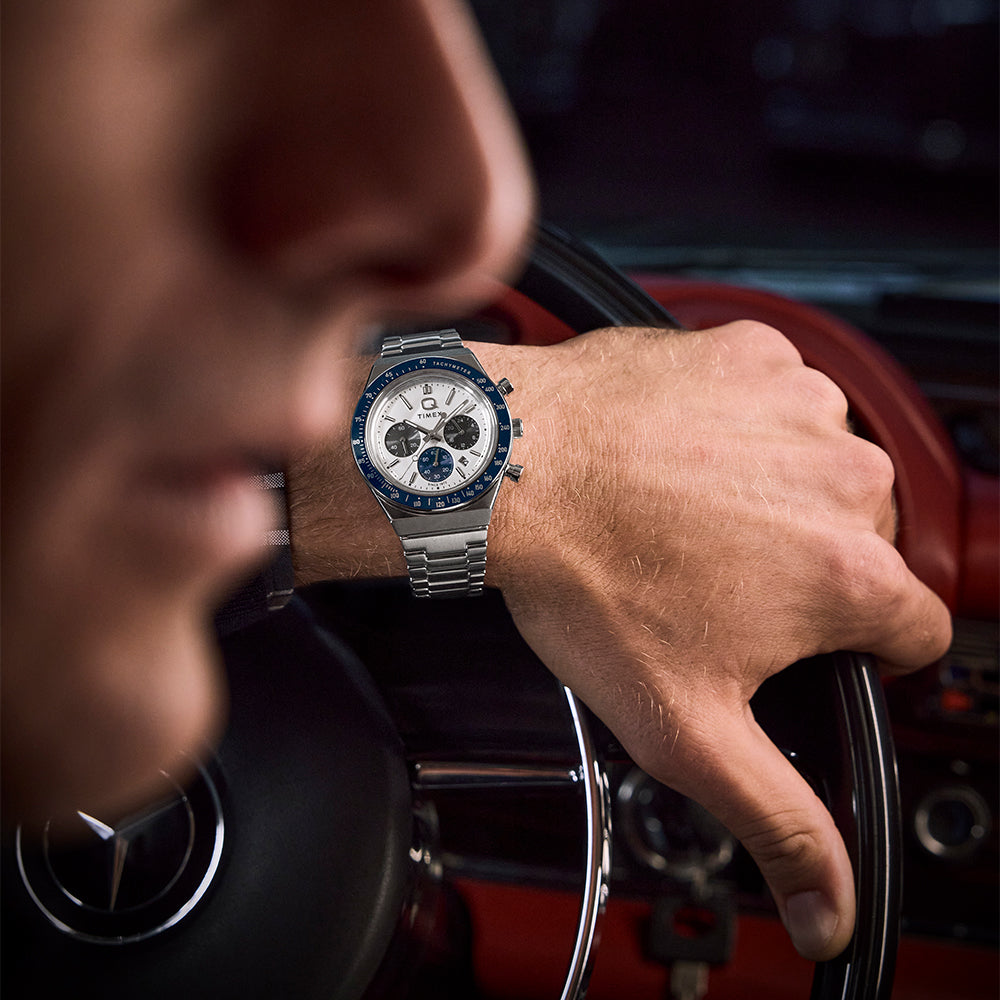 Roar across the finish line with our high-performing Q Timex Chronograph. Inspired by the original motoring watches that graced the tracks of Europe’s most iconic races, this timepiece celebrates the endurance of our legendary 1970s Q Timex. An ultra-precise chronograph movement and tachymeter bezel recreate the finesse and function of a true racing watch, allowing you to determine elapsed time and average speed like the greatest daredevils in motorsports. Sophisticated tonal sub-dials, a date feature, dimensional metallic indices, and an updated Q Timex logo stand beautifully against a white dial, while a stainless-steel crown and brushed and polished 40mm recycled stainless-steel case bring dynamism and durability to its retro construction. Infinitely wearable, it presents a brushed recycled stainless-steel bracelet with integrated lugs.