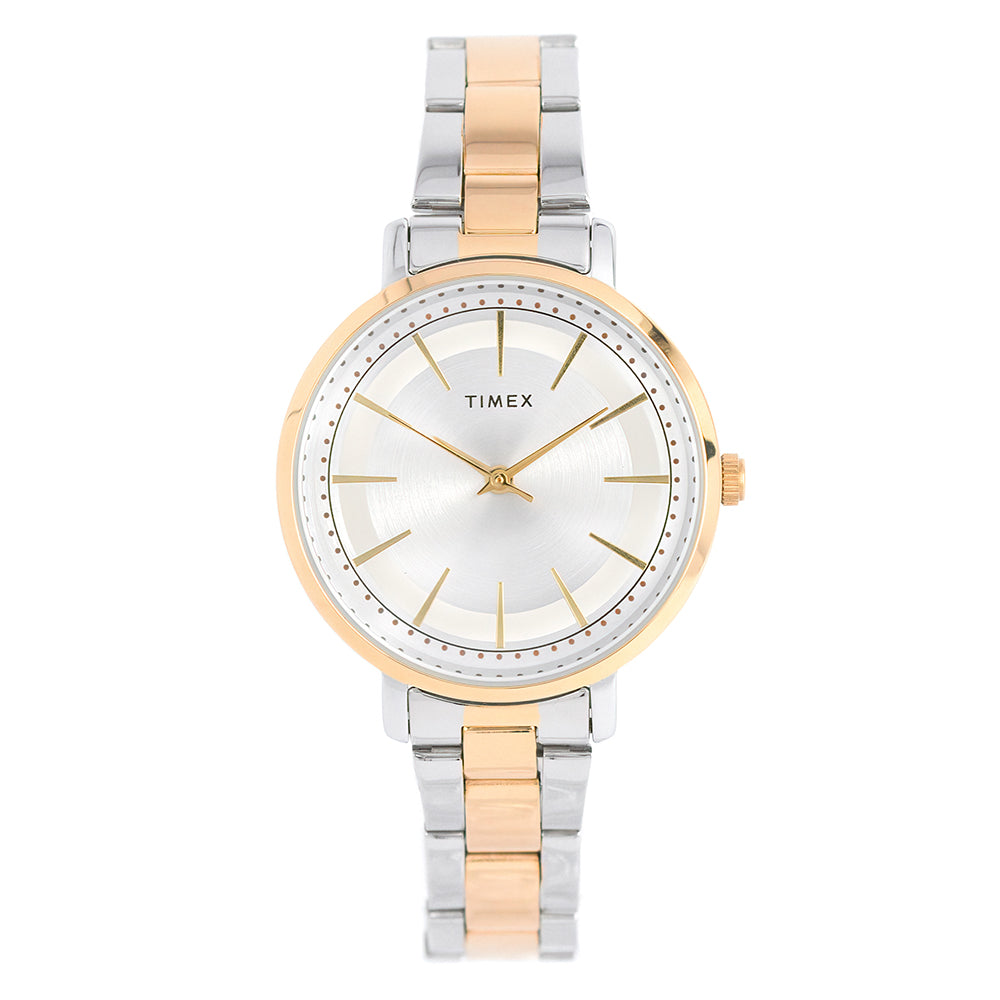 A refined women’s timepiece with a 34mm two-tone case and a sleek, minimalist silver dial, ideal for those who appreciate subtle elegance and simplicity.